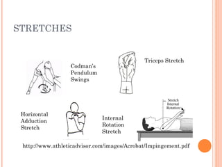 Specific changes in the program will be made by the physician as appropriate for the individual patient. The shoulder that can contribute to developing an impingement. While keeping the elbow straight pull the arm toward the rear.